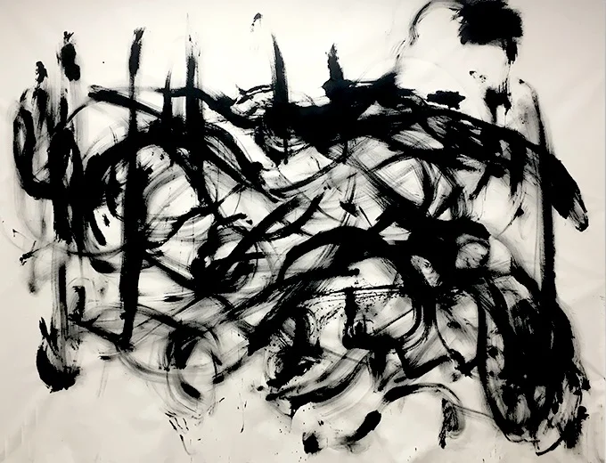 Hairpainting No 14 is set to a score of Jarrett interviewing family members about his late grandmother. They discussed what was she like, what she wore, her daily rituals. These memories combined with a set of 4-5 choreographed movements birth the full performance. The deliberate use of Black hair - an intensely charged symbol of respectability politics, workplace discrimination, and beauty standards - as the mark-making tool is key in the series. It underscores the personal and political nature of Jarrett's work.