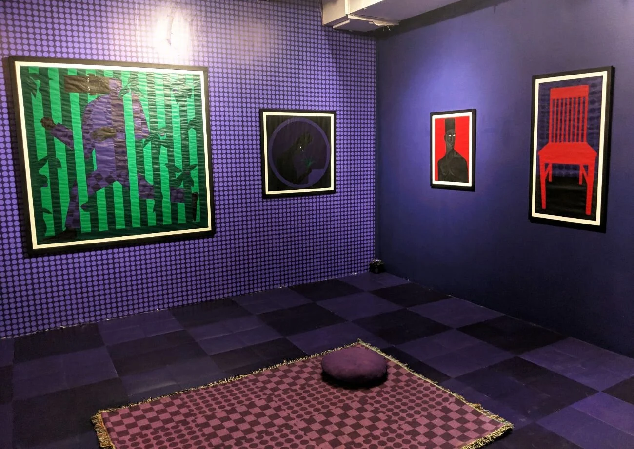 The first room titled “The Violet Den” is filled with work by artist Jon Key and is a constructed space of refuge and rest for the recurring character that appears in the majority of his paintings, the Man in the Violet Suit. According to Key, “[the room’s] surroundings simultaneously examine the interior psychology and reality of the Queer Black man.” By deconstructing the Violet Suit pattern and figure with each painting and found object abstraction, Key will extend the mythology of the The Man in the Violet Suit’s journey. Within this space we are given a reflection of what one man becomes outside the suited image that embodies who he is in the outside world.